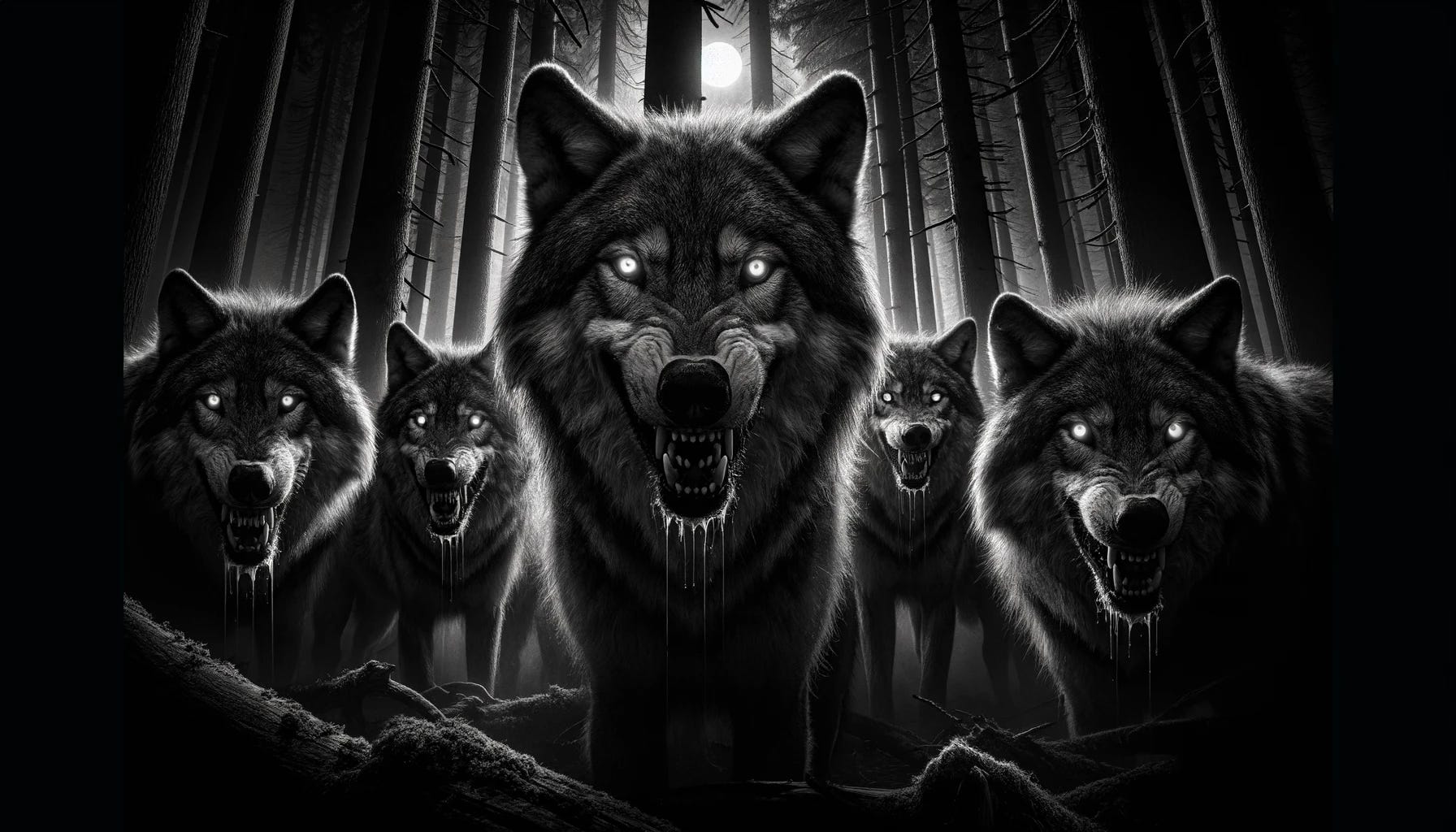 A pack of timber wolves moves silent through the frozen forest. A short distance away, a deer struggles with a broken hind leg. The alpha catches the scent, and the pack follows his lead. Loping towards the doomed deer, they soon close the distance.